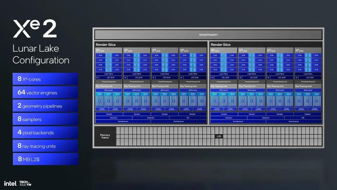第一款采用Xe2 GPU的产品是集成配置的Lunar Lake。Lunar Lake中的多个区块都与GPU有关,如媒体引擎和显示引擎。Lunar Lake Xe2 GPU有8个Xe2内核,每个Xe2内核有8个XMX和8个矢量单元、一个负载/存储单元、一个线程排序单元和一个专用的 L1/L$ 缓存。这4个Xe2内核中的每一个都能生成一个渲染片。